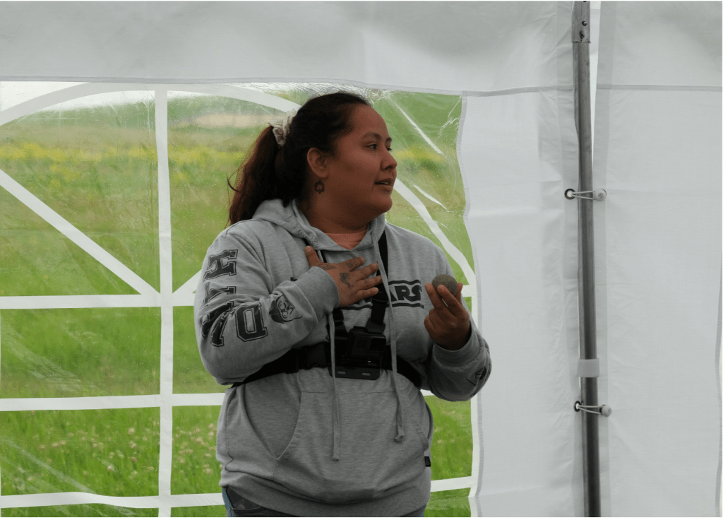 Dr. Kori Cuzy took the youth and children soil campers into a compelling journey to explore the significance and meanings of plants (sage, tobacco, sweetgrass, cedar) through a series of enchanting stories. The storytelling session was hosted inside a tipi where Dr. Cuzy touched on the history of the land (Land of Dreams) that was primarily used for industrial mono-culture farming, followed by the story of kinship between the three sisters (known as bean, squash, and corn) that encouraged the listeners to ponder upon the strength of diversity for a more sustainable present and future. This story also highlighted the importance of regenerating diversity for not only those on the land but also inside the soil to build a future based on kindness to our ‘more than human’ kins. Dr. Cuzy’s stories centred messages of gratitude and reciprocity, inviting listeners to reflect on acknowledging the land through collective and individual actions.