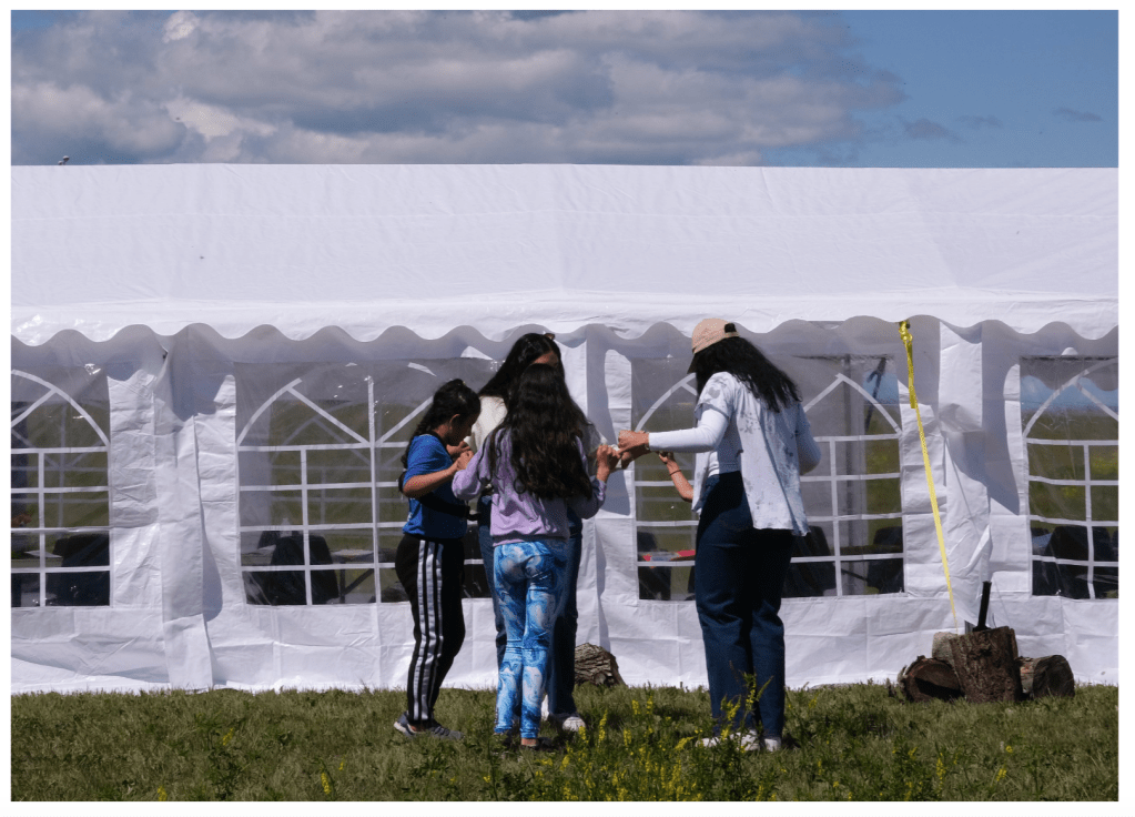 Prior to the beginning of summer programs, the Land of Dreams invited members of a local Indigenous community to the land to build a tipi (of Cree tradition) that was graciously gifted by the community to the people who gathered on the land. The tipi provided a comfortable shelter and shaded space for those on the land to avoid the heat as summer 2021 was exceptionally hot due to climate change. One of the Indigenous members who built the tipi left a beautiful message to gatherers on the land, saying, “Buffalo bones are sleeping deep inside the soil. With the care of regenerating the soil, buffalo might come back.” On the first day at the camp, soil campers were invited into the tipi and engaged in curious conversations regarding the engineering of tipi building. Soil campers also partook in an activity to honor the history of land stewardship, in which a number line was set up starting from the tipi to conceptualize the duration of Indigenous people’s stewardship of the land in an embodied manner.