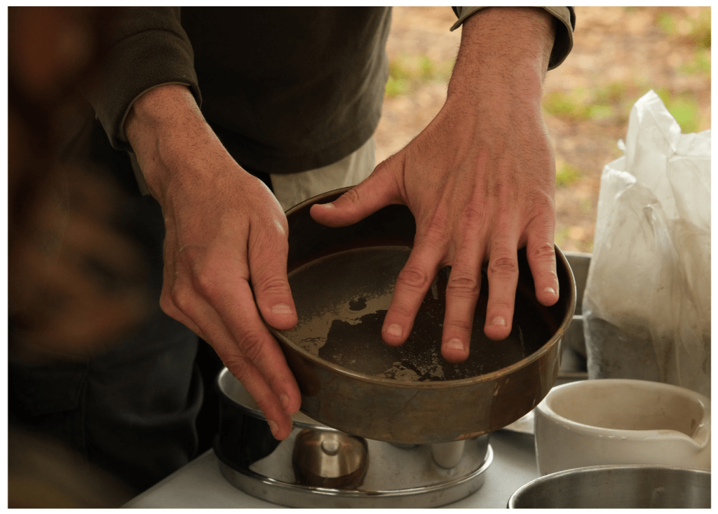Soil campers engaged in a chemistry experiment to test naturally occurring acid base indicators found in red cabbage leaves to understand anthocyanins or water-soluble pigments that change color depending on a specific pH level. The mixing of different solutions provided the opportunity to test a variety of substances in the red cabbage pH indicator that allowed soil campers to witness how transitional phases and spectrums of color change occur. This inquiry-based learning process piqued soil campers’ curiosities to make connections between the red cabbage and the vegetation found at the Land of Dreams, such as berries and kale, that are also high in anthocyanin, containing similar phenol compounds. Soil campers were fascinated by the color changes that led to further questions and reflections, making this activity a highly engaging and full of inquiry rich investigation.