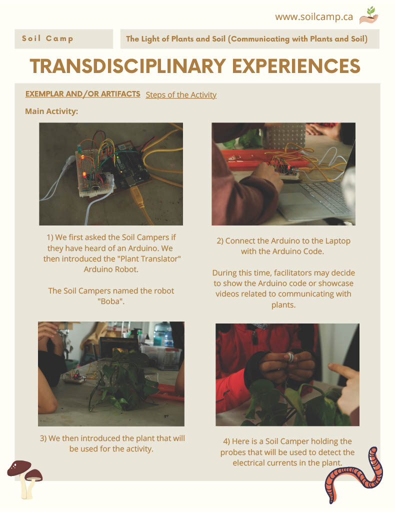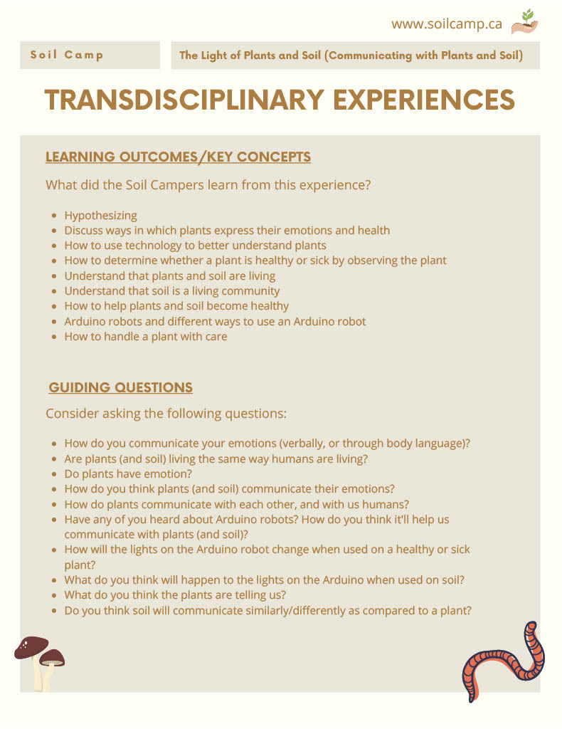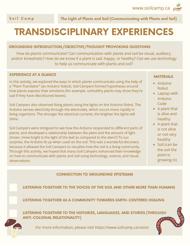This activity invited soil campers to engage in imaginative and intentional listening to hear the language of the plants as translated through music on speakers. Soil campers initiated creative and contemplative conversations regarding the music source and interacted with the plants by singing in different languages to observe the changes in music generated by the plants. This reciprocal interaction allowed soil campers to build an intimate connection to the plants without the need to speak verbally but rather communicating in a language beyond words and listening to what our ears otherwise cannot hear. Soil campers also further explored plant communication through the wondrous world of robots and coding by placing electrodes on leaves of the plants that translated electromagnetic waves from the leaves into musical notes through a connected device - shifting soil campers’ view of plants from just a passive element of nature to an empathetic, emotional, and intelligent life form that needs to be treated respectfully and tend with care.