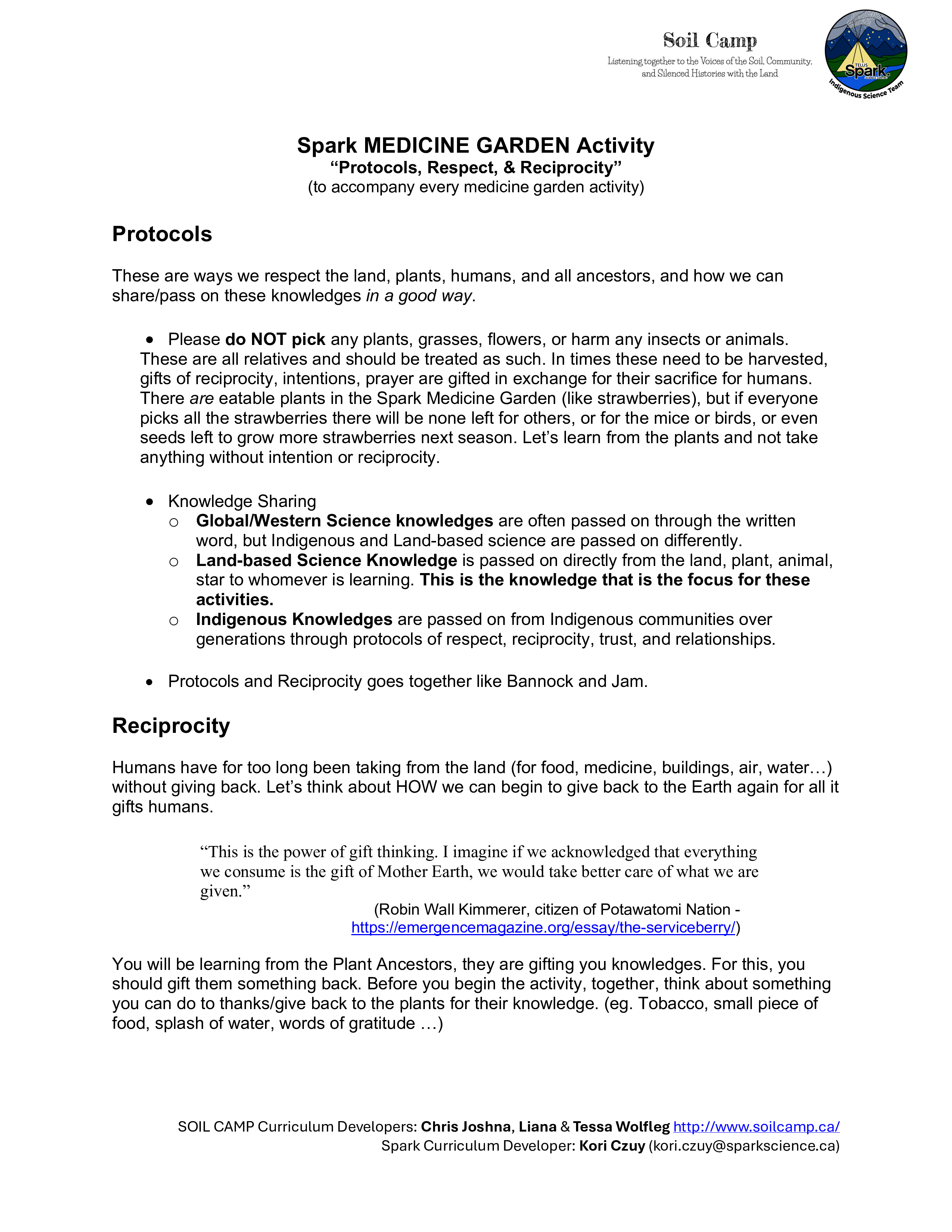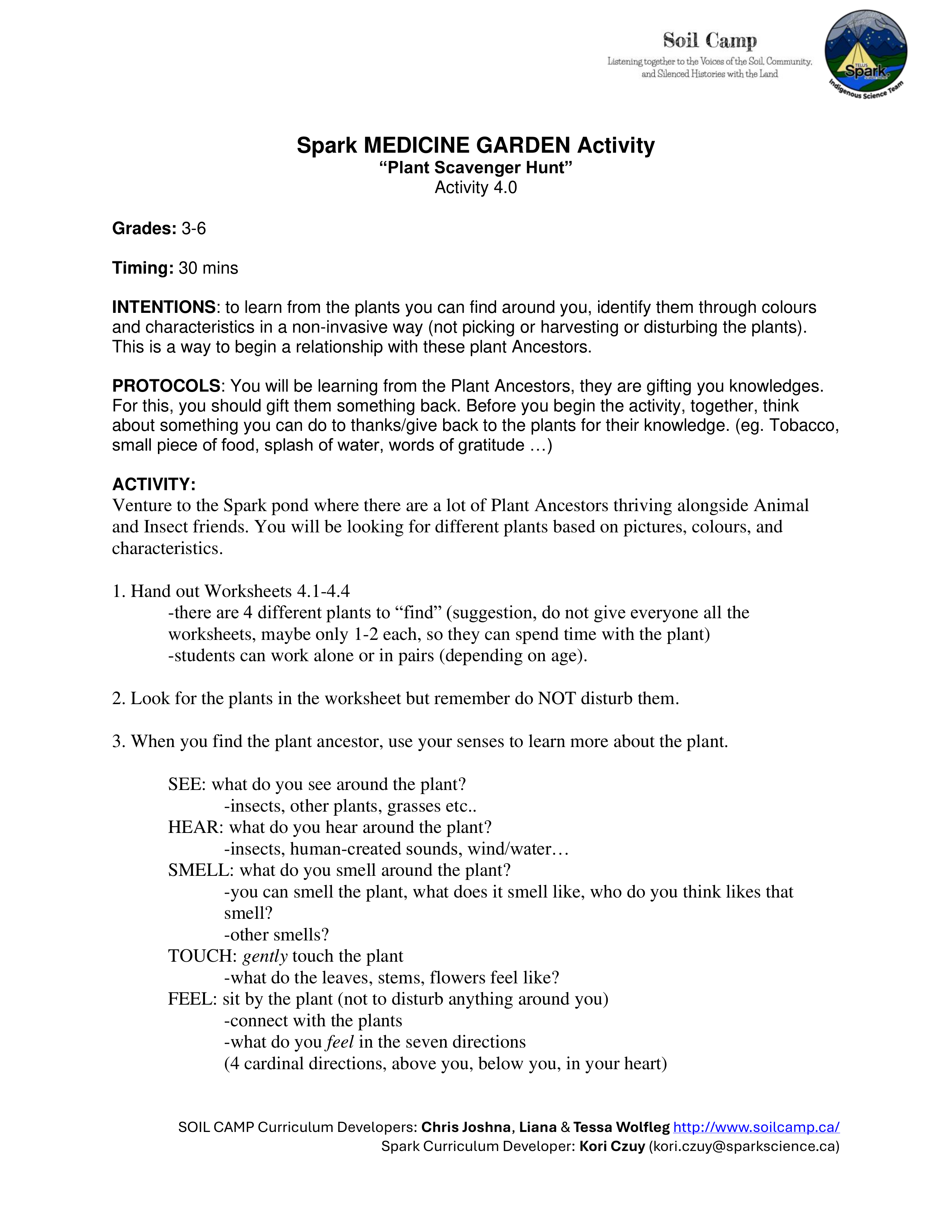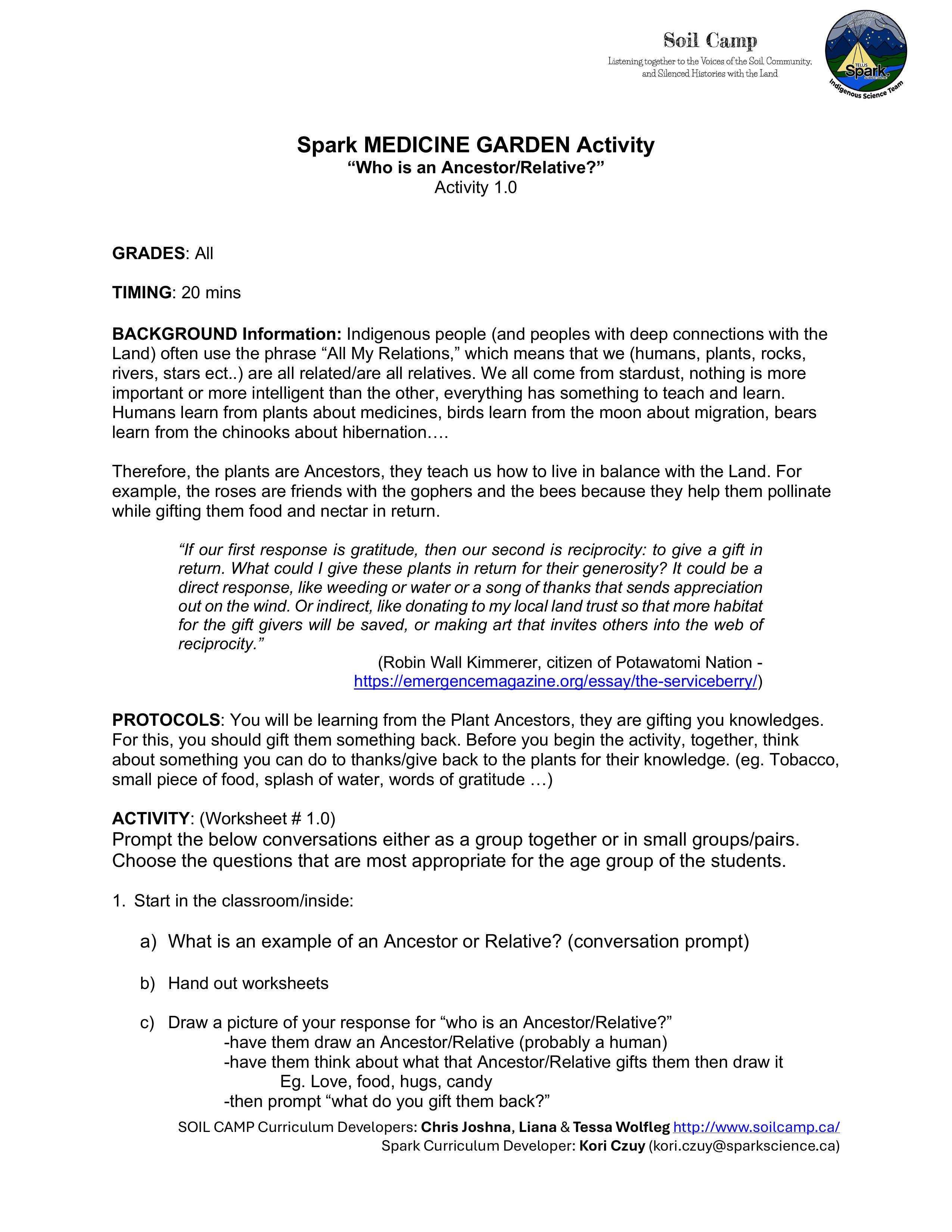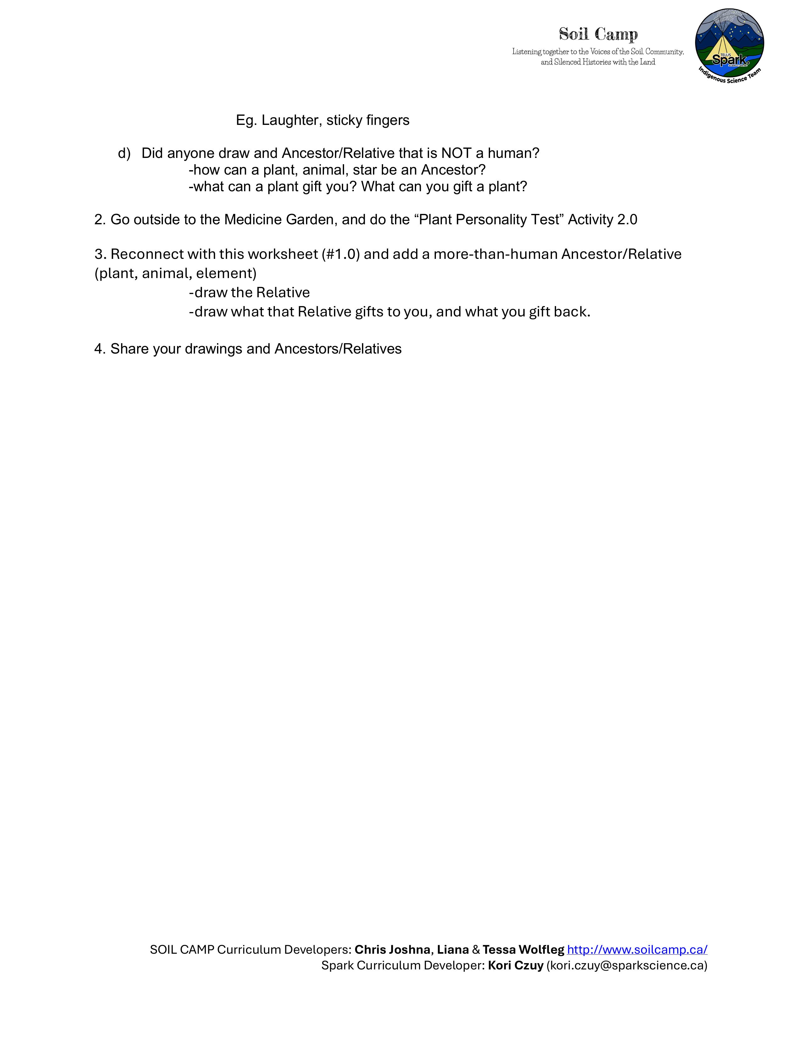 Soil Camp collaborated with Spark’s Indigenous Science Connections team—Dr. Kori Czuy and Alex Flett—to co-design the series of activities below, grounded in the teachings of the on-site medicine garden. These activities explore human-plant relationships and can be adapted to various learning contexts.