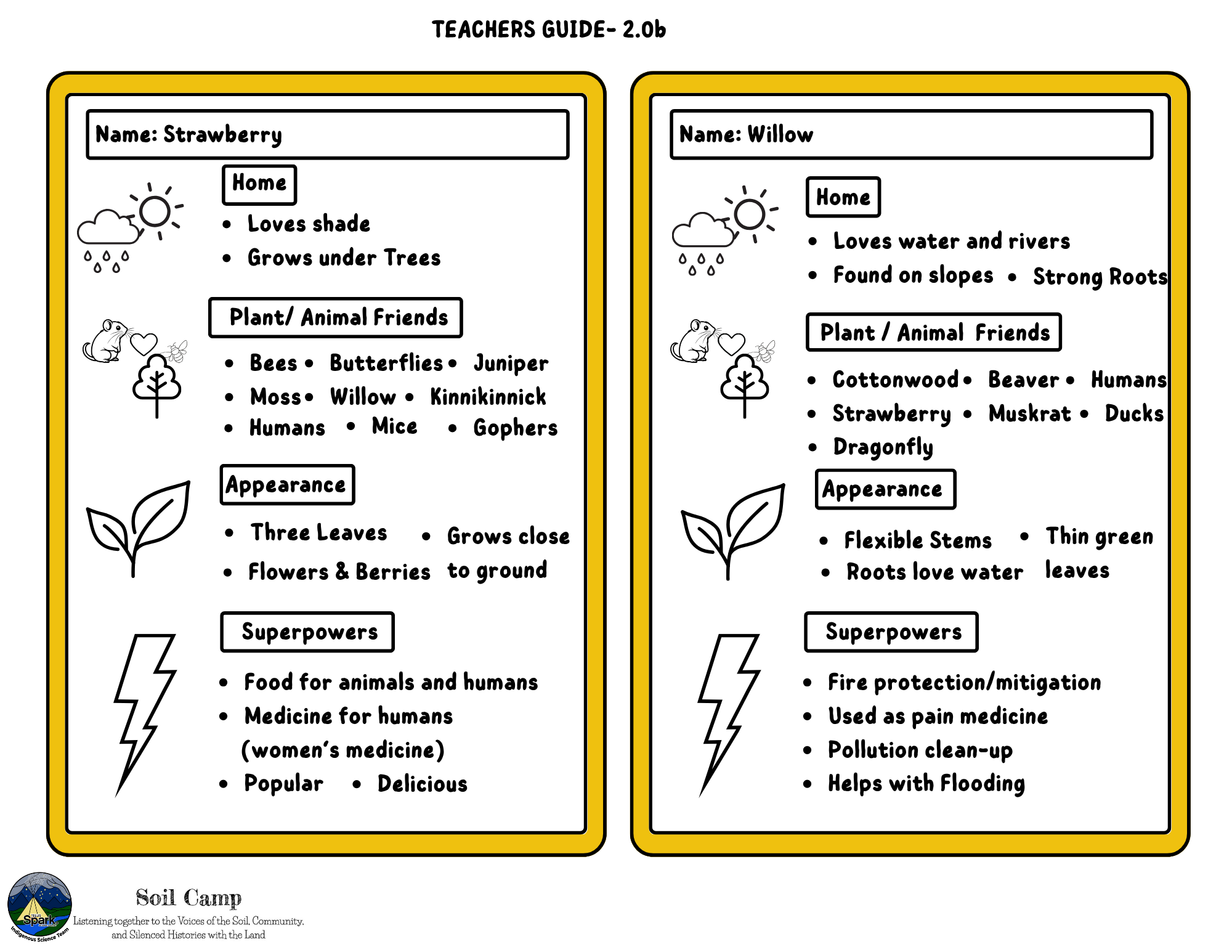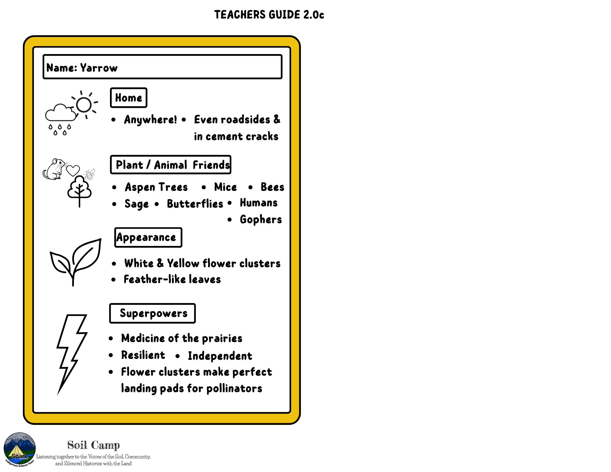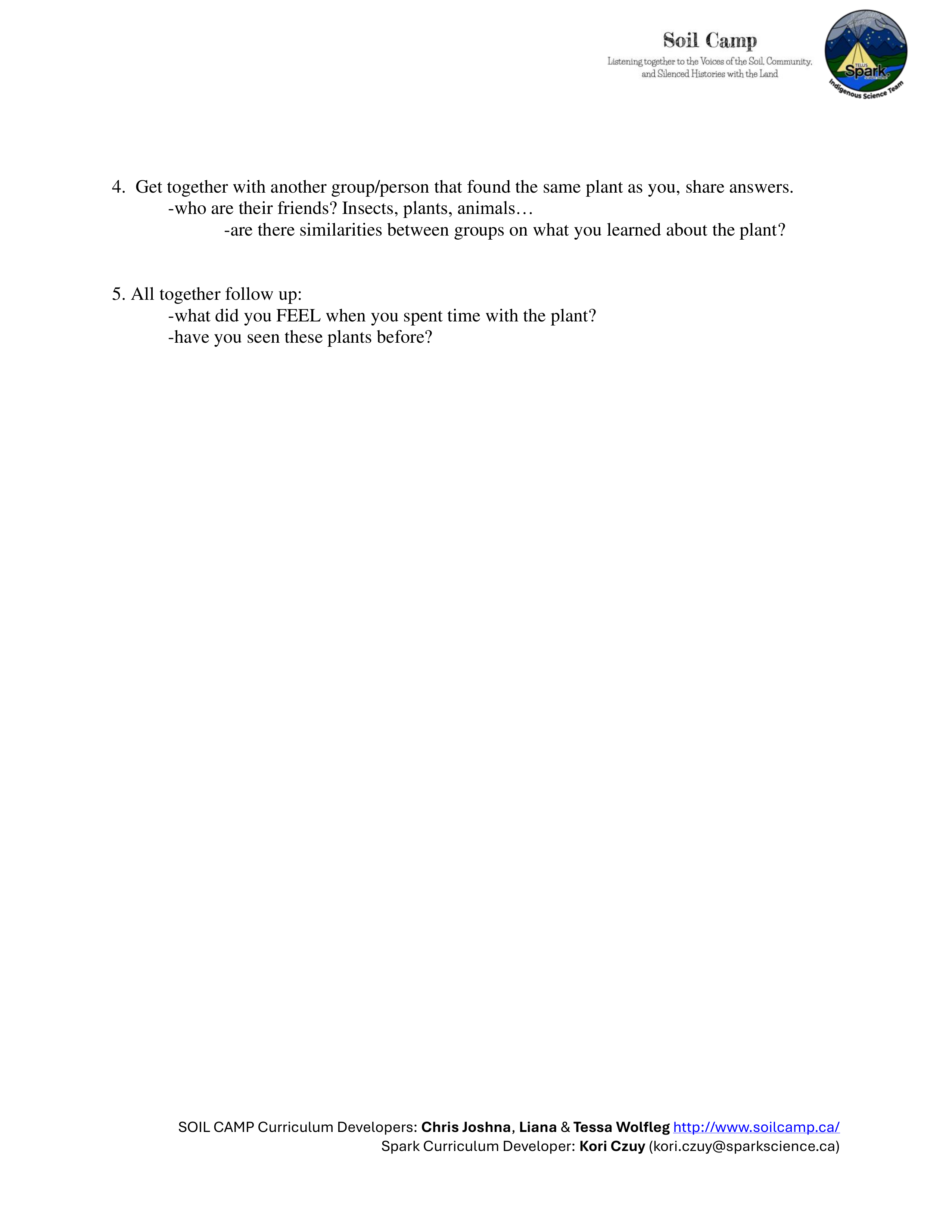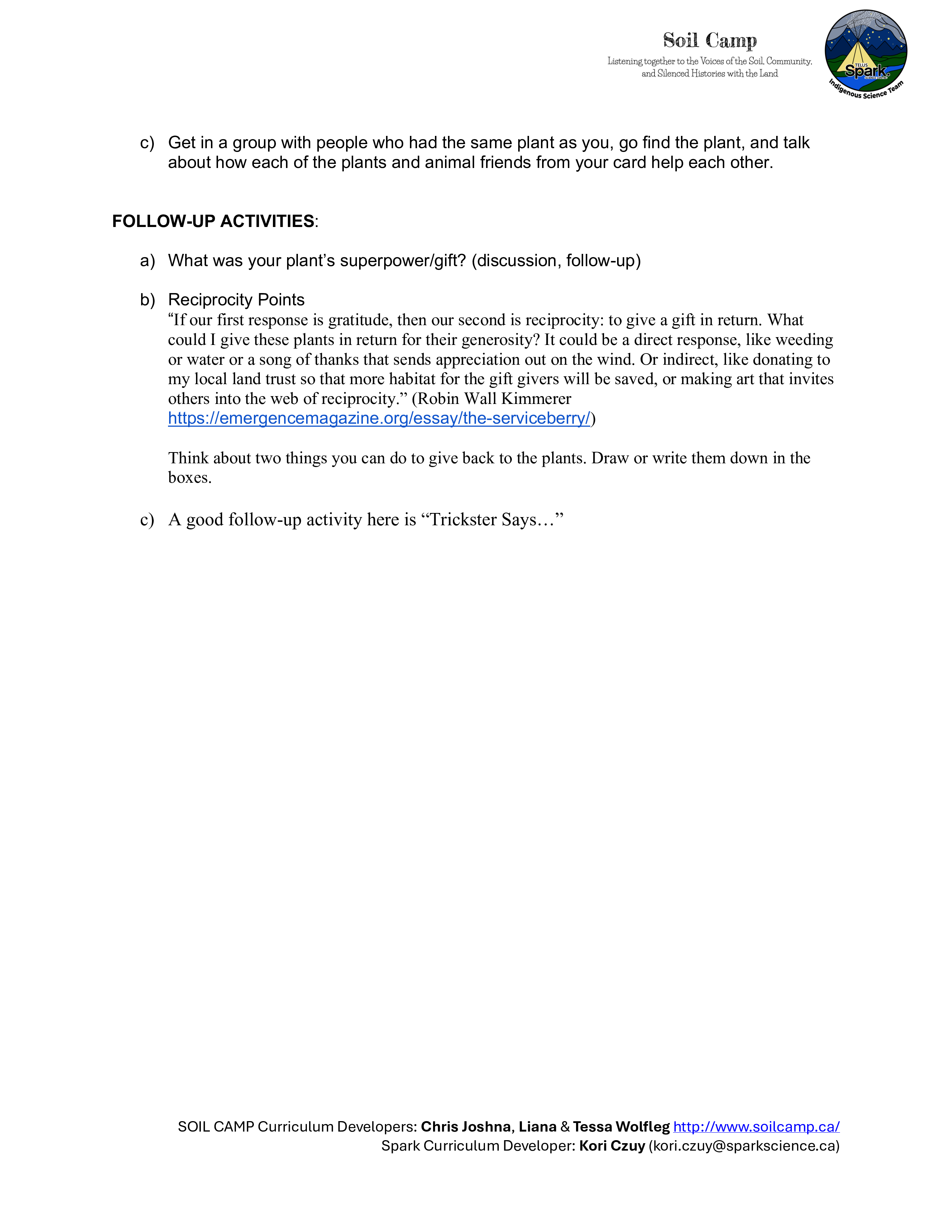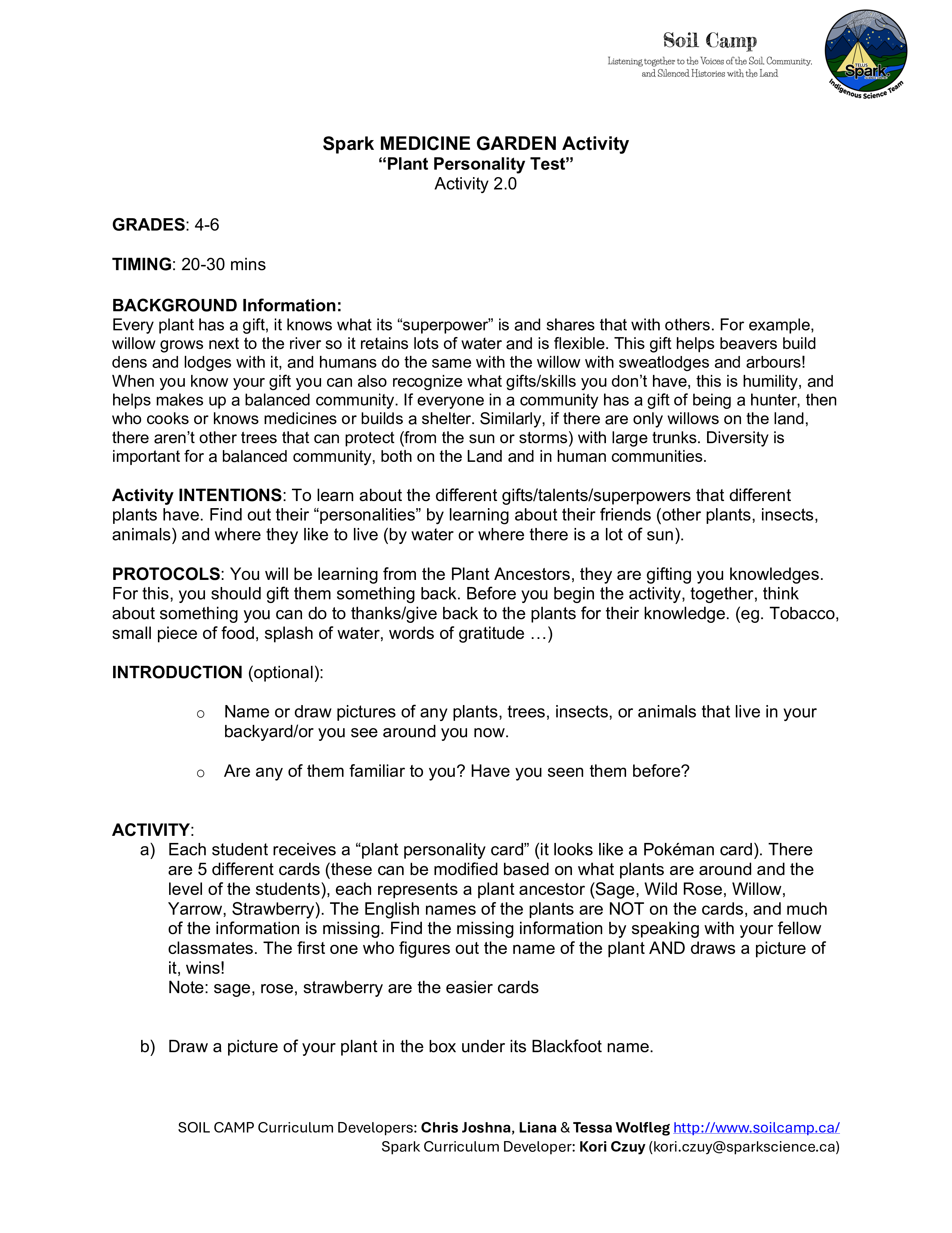 Soil Camp collaborated with Spark’s Indigenous Science Connections team—Dr. Kori Czuy and Alex Flett—to co-design the series of activities below, grounded in the teachings of the on-site medicine garden. These activities explore human-plant relationships and can be adapted to various learning contexts.